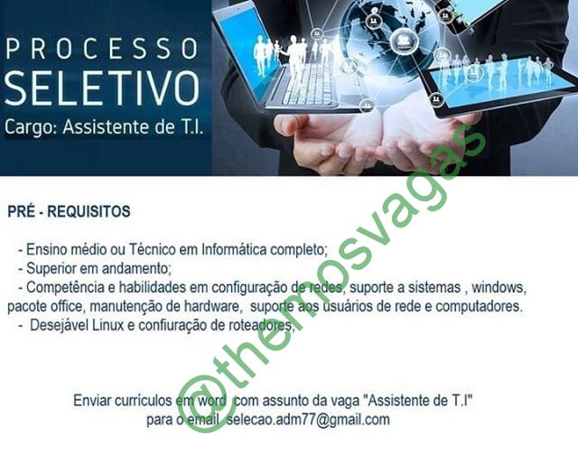 – Interessados(as) e que atendam ao perfil solicitado acima, devem enviar o currículo para o e-mail selecao.adm77@gmail.com contendo no título/assunto “Assistente de TI”.