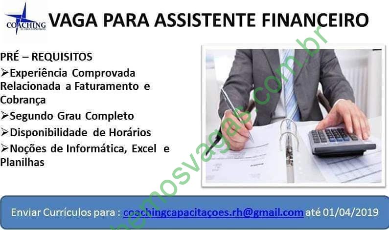 Interessados(as) e que atendam aos requisitos devem enviar o perfil profissional até o dia 01/04/2019, colocando no título do e-mail “Assistente Financeiro “, para: coachingcapacitacoes.rh@gmail.com