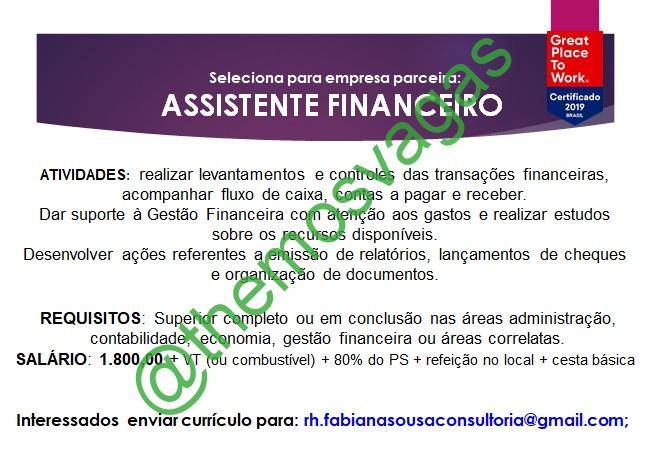 – Interessados(as) e que atendam ao perfil solicitado acima, devem enviar o currículo para o e-mail rh.fabianasousaconsultoria@gmail.com contendo no título/assunto “Assistente Financeiro – FOR
