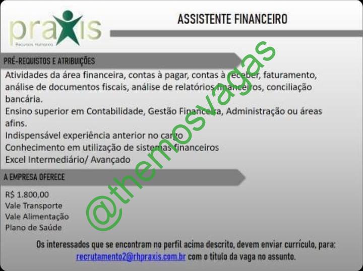 – Interessados(as) e que atendam ao perfil solicitado acima, devem enviar o currículo para o e-mail recrutamento2@rhpraxis.com.br, contendo no título/assunto “Assistente Financeiro – FOR”.
