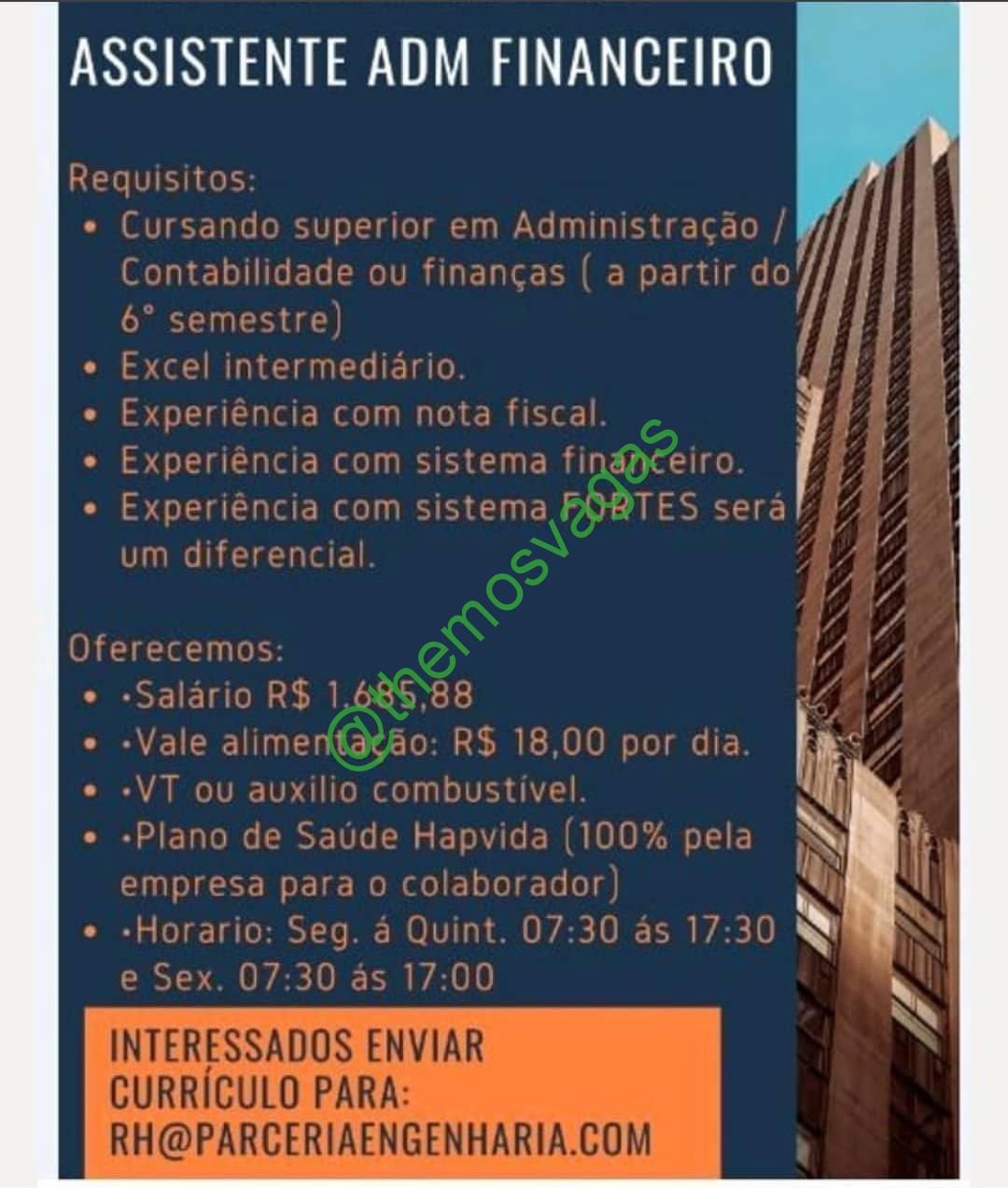 – Interessados(as) e que atendam ao perfil solicitado acima, devem enviar o currículo para o e-mail rh@parceriaengenharia.com, contendo no titulo/assunto “Assistente Financeiro – FOR