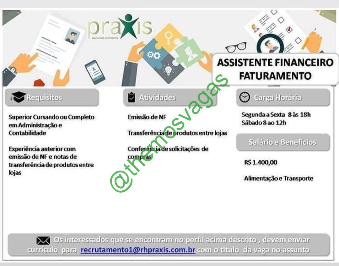 – Interessados(as) e que atendam ao perfil solicitado acima, devem enviar o currículo para o e-mail recrutamento1@rhpraxis.com.br, contendo no titulo/assunto “Assistente Financeiro (Faturamento) – FOR