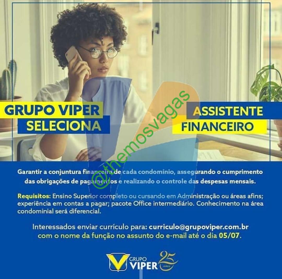 – Interessados(as) e que atendam ao perfil solicitado acima, devem cadastrar o currículo até 05/07/2021 para o e-mail curriculo@grupoviper.com.br, contendo no titulo/assunto “Assistente Financeiro – FOR”.