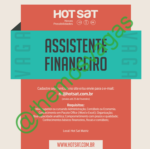 – Interessados(as) e que atendam ao perfil solicitado acima, devem enviar o currículo até 25/02/2021 para o e-mail rh@hotsat.com contendo no título/assunto “Assistente Financeiro THE