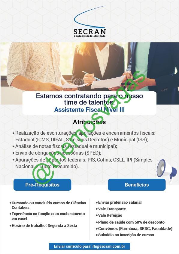 – Interessados(as) e que atendam ao perfil solicitado acima, devem enviar o currículo para o e-mail rh@secran.com.br , colocando no título “Assistente Fiscal III”.