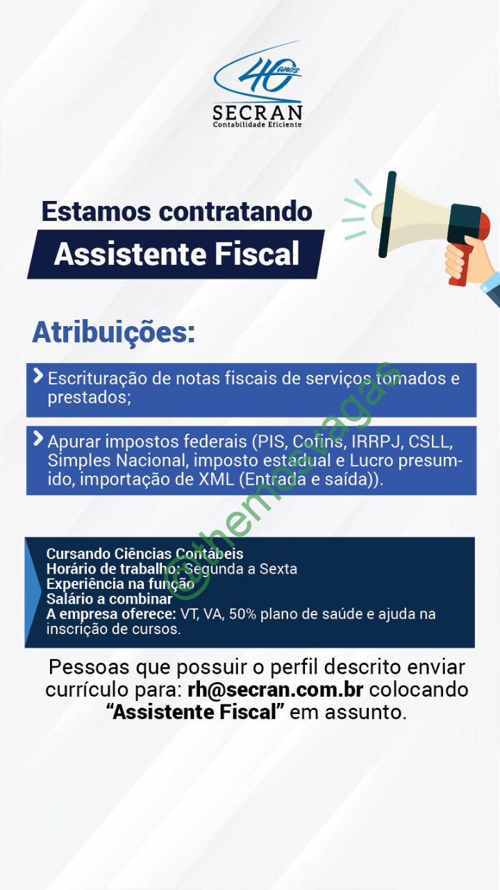 – Interessados(as) e que atendam ao perfil solicitado acima, devem enviar o currículo para o e-mail rh@secran.com.br , colocando no título “Assistente Fiscal”.