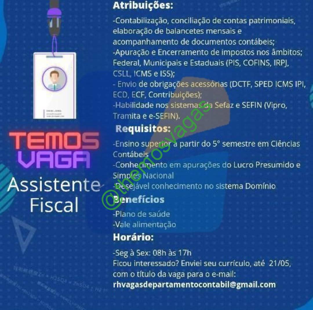 – Interessados(as) e que atendam ao perfil solicitado acima, devem enviar o currículo até 21/05/2021 para o e-mail rhvagasdepartamentocontabil@gmail.com , contendo no título/assunto “Assistente Fiscal – FOR“.