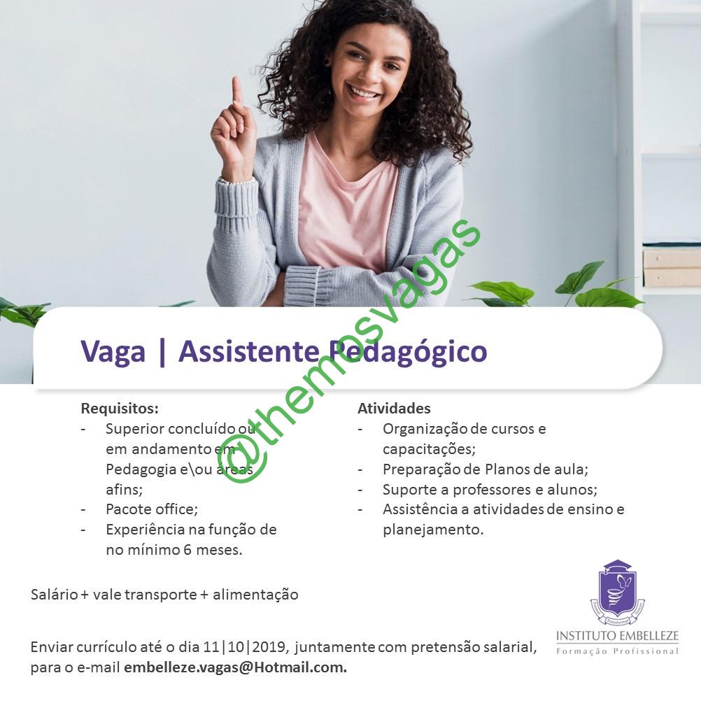 – Interessados(as) e que atendam ao perfil solicitado acima, devem enviar o currículo para o e-mail embelleza.vagas@hotmail.com até o dia 11/10/2019 , colocando no título “Assistente Pedagógico”.