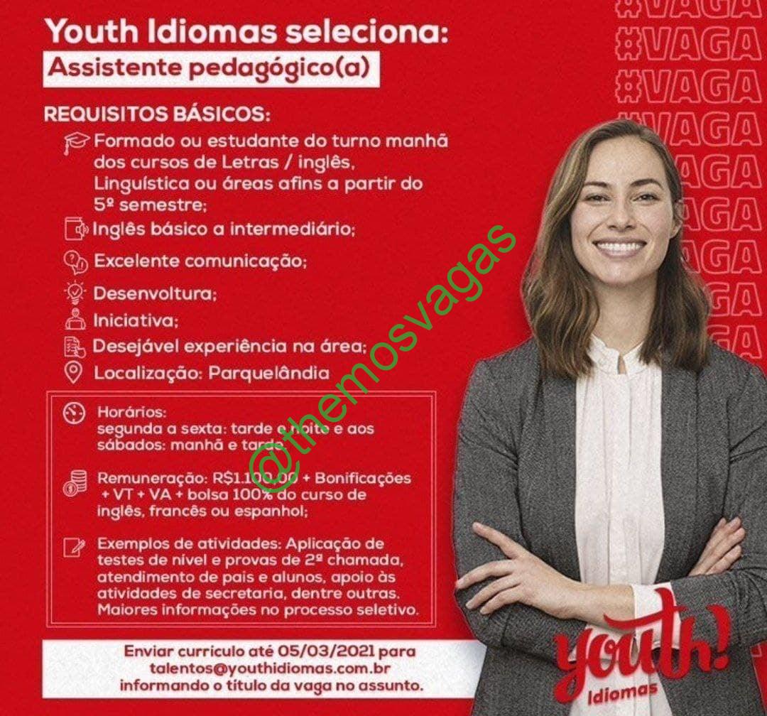 – Interessados(as) e que atendam ao perfil solicitado acima, devem  enviar o currículo até 05/03/2021 para e-mail talentos@youthidiomas.com.br, contendo no titulo/assunto “Assistente Pedagógico – FOR”.