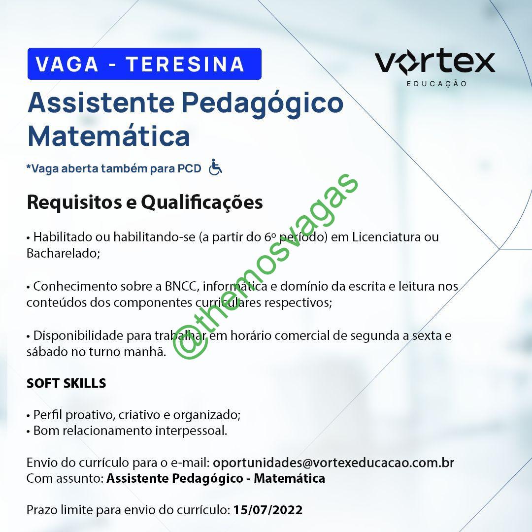 – Interessados(as) e que atendam ao perfil solicitado acima, devem enviar o currículo até 15/07/2022 para o e-mail oportunidades@vortexeducacao.com.br contendo no título/assunto “Assistente Pedagógico – Matemática
