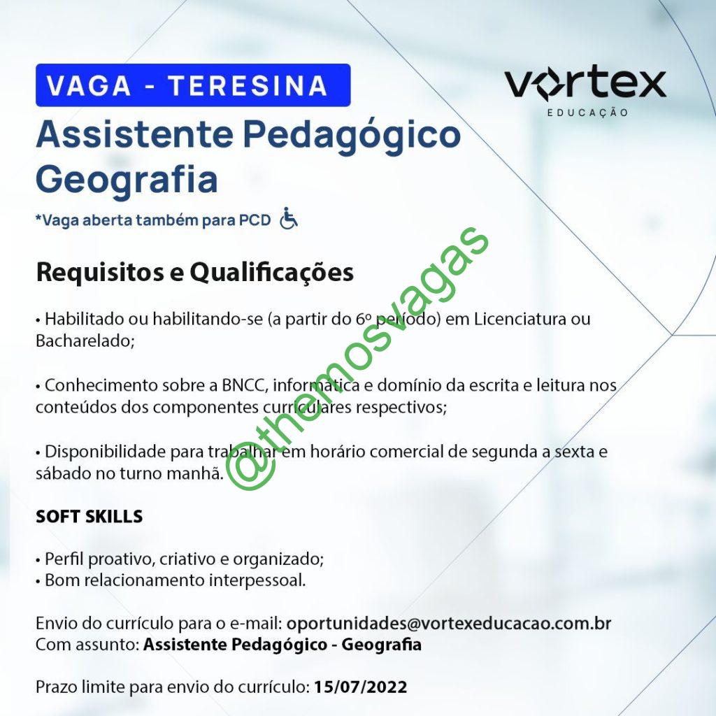 – Interessados(as) e que atendam ao perfil solicitado acima, devem enviar o currículo até 15/07/2022  para o e-mail oportunidades@vortexeducacao.com.br contendo no título/assunto “Assistente Pedagógico – Geografia
