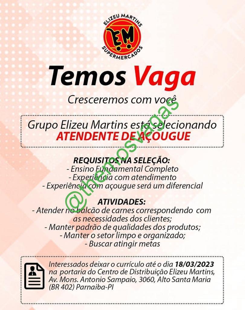 – Interessados(as) e que atendam ao perfil solicitado acima, devem entregar o currículo até 18/03/2023 neste endereço: Av. Mons. Antônio Sampaio, 3060, Alto Santa Maria (BR 402), Parnaíba – PI (na portaria do Centro de Distribuição Elizeu Martins).