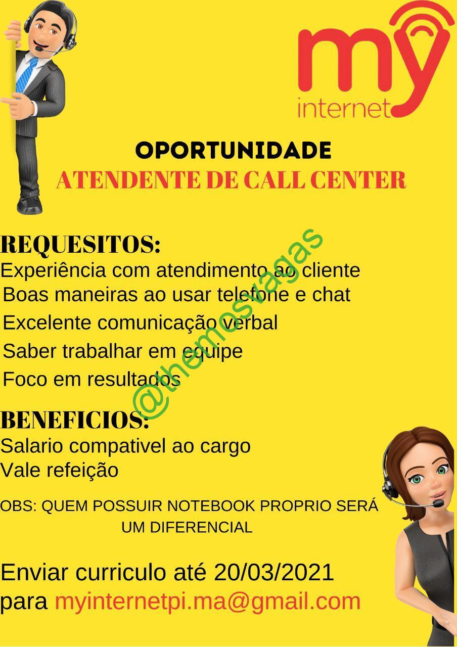 – Interessados(as) e que atendam ao perfil solicitado acima, devem enviar o currículo até 20/03/2021 para o e-mail myinternetpi.ma@gmail.com contendo no título/assunto “Atendente de Cal Center  THE