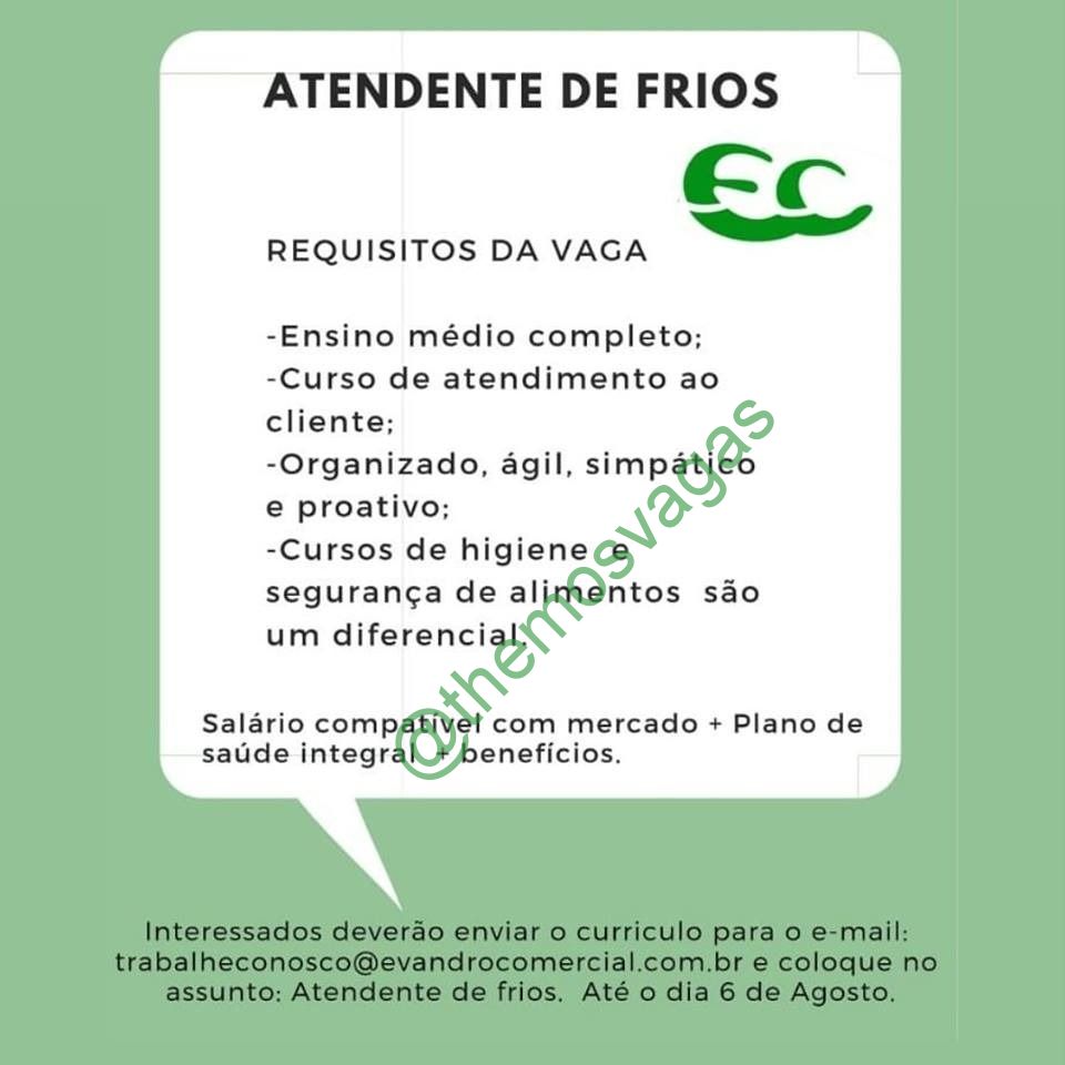 – Interessados(as) e que atendam ao perfil solicitado acima, devem enviar o perfil profissional até 06/08/2019 para o e-mail trabalheconosco@evandrocomercial.com.br contendo no título/assunto “Atendente de Frios“.