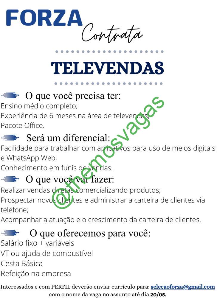 – Interessados(as) e que atendam ao perfil solicitado acima, devem enviar o currículo até 20/05/2021 para o e-mail selecaoforza@gmail.com, contendo no título/assunto “Atendente de Telemarketing – FOR