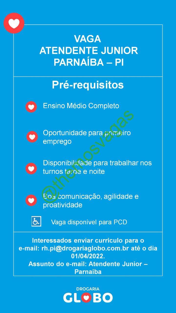 – Interessados(as) e que atendam ao perfil solicitado acima, devem enviar o currículo até 01/04/2022  para o e-mail rh.pi@drogariaglobo.com.br contendo no título/assunto “Atendente Júnior – Parnaíba