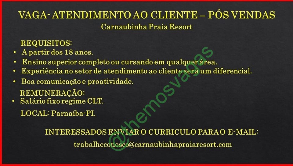 – Interessados(as) e que atendam aos requisitos devem enviar o perfil profissional, colocando no título do e-mail “Atendente Pós-vendas”, para:  trabalheconosco@carnaubinhapraiaresort.com