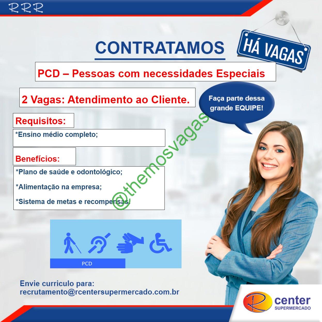 – Interessados(as) e que atendam ao perfil solicitado acima, devem enviar o currículo para o e-mail recrutamento@rcentersupermercado.com.br , colocando no título “Atendimento (PCD)”.