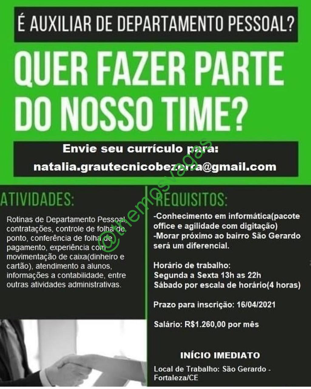 – Interessados(as) e que atendam ao perfil solicitado acima, devem enviar o currículo até dia 12/05/2021 para o e-mail natalia.grautecnicobezerra@gmail.com, contendo no título/assunto “Aux de Departamento Pessoal – FOR“.