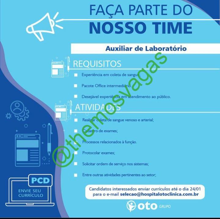 – Interessados(as) e que atendam ao perfil solicitado acima, devem até o dia 24|01|2021 enviar o currículo para o e-mail selecao@hospitalotoclinica.com.br, contendo no título/assunto “Auxiliar de Laboratório – FOR