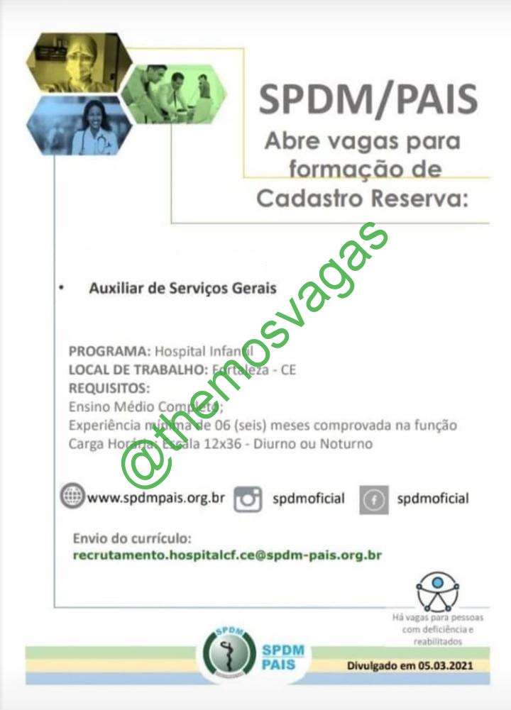 – Interessados(as) e que atendam ao perfil solicitado acima, devem enviar o currículo para o e-mail recrutamento.hospitalcf.ce@spdm-pais.org.br , contendo no título/assunto “Aux de Serviços Gerais – FOR”.