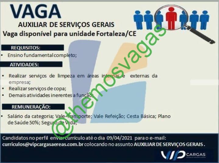 – Interessados(as) e que atendam ao perfil solicitado acima, devem enviar até o dia 09|04|2021 o currículo para o e-mail curiculos@vipcargasaereas.com.br, contendo no título/assunto “Auxiliar de Serviços Gerais – FOR”.