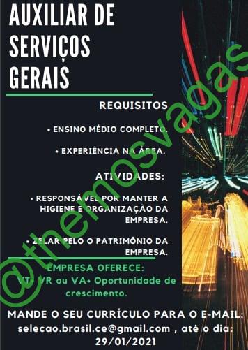 – Interessados(as) e que atendam ao perfil solicitado acima, devem enviar o currículo até 29/01 para o e-mail selecao.brasil.ce@gmail.com, contendo no título/assunto “Aux de Serviços Gerais – FOR