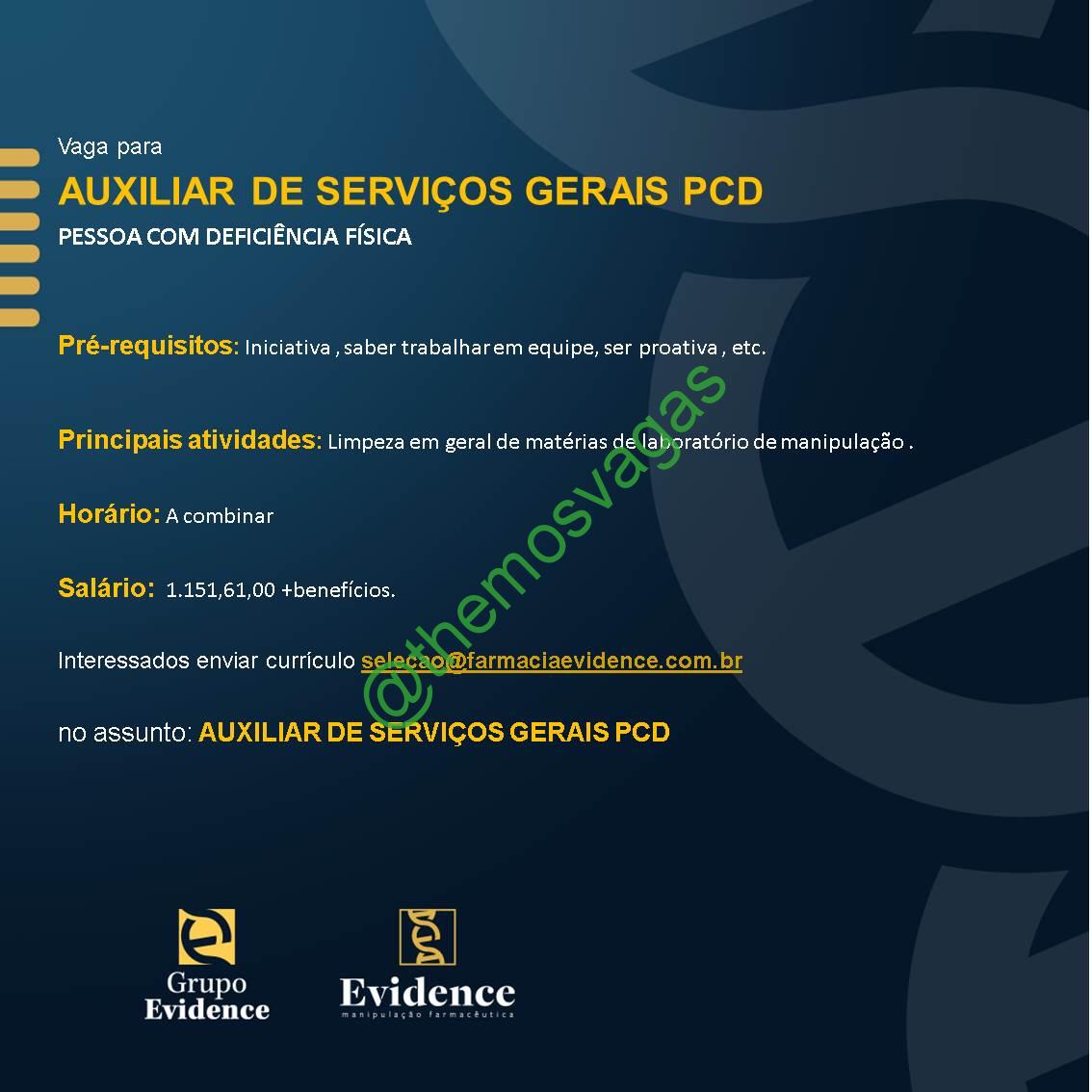 – Interessados(as) e que atendam ao perfil solicitado acima, devem enviar o currículo para o e-mail selecao@farmaciaevidence.com.br, contendo no título/assunto “Aux de Serviços Gerais PCD – FOR