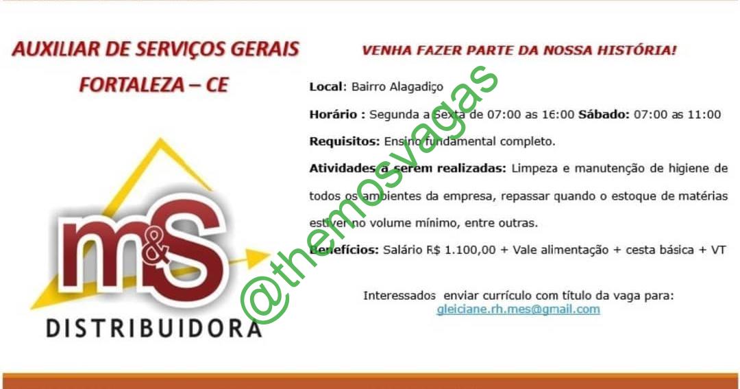 –  Interessados(as) e que atendam ao perfil solicitado acima, devem enviar o currículo para o e-mail gleiciane.rh.mes@gmail.com, contendo no titulo/assunto “Auxiliar de Serviços Gerias – FOR”.