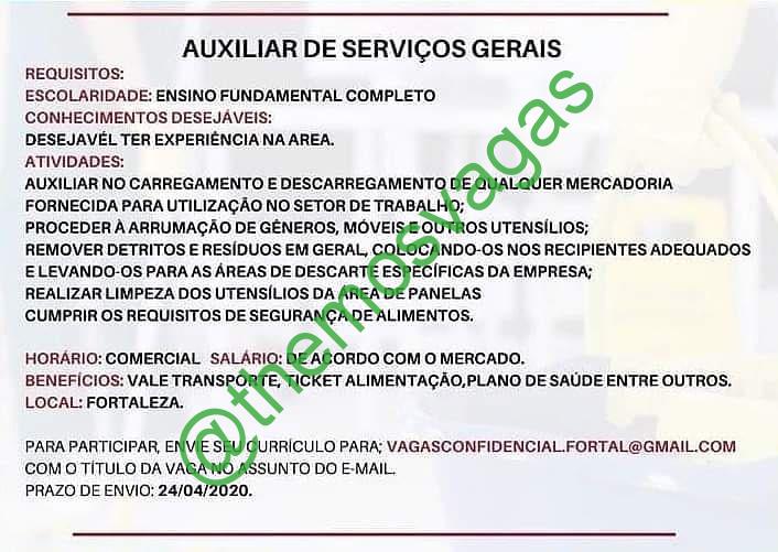 – Interessados(as) e que atendam ao perfil solicitado acima, devem até o dia 24/04/2020 enviar o currículo para o e-mail vagasconfidencial.fortal@gmail.com , colocando no título “Auxiliar Serviços Gerais”.