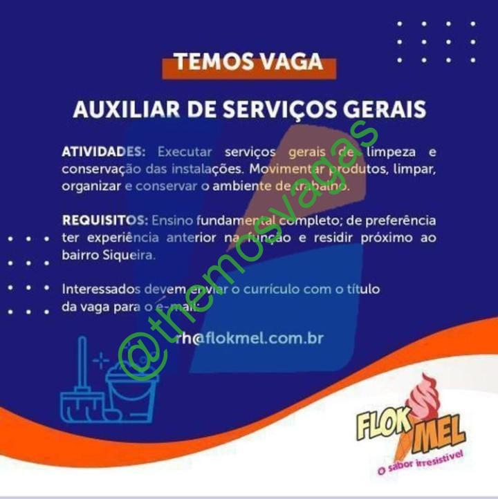 – Interessados(as) e que atendam ao perfil solicitado acima, devem enviar o currículo para o e-mail rh@flokmel.com.br, contendo no título/assunto “Auxiliar Serviços Gerais – FOR”.