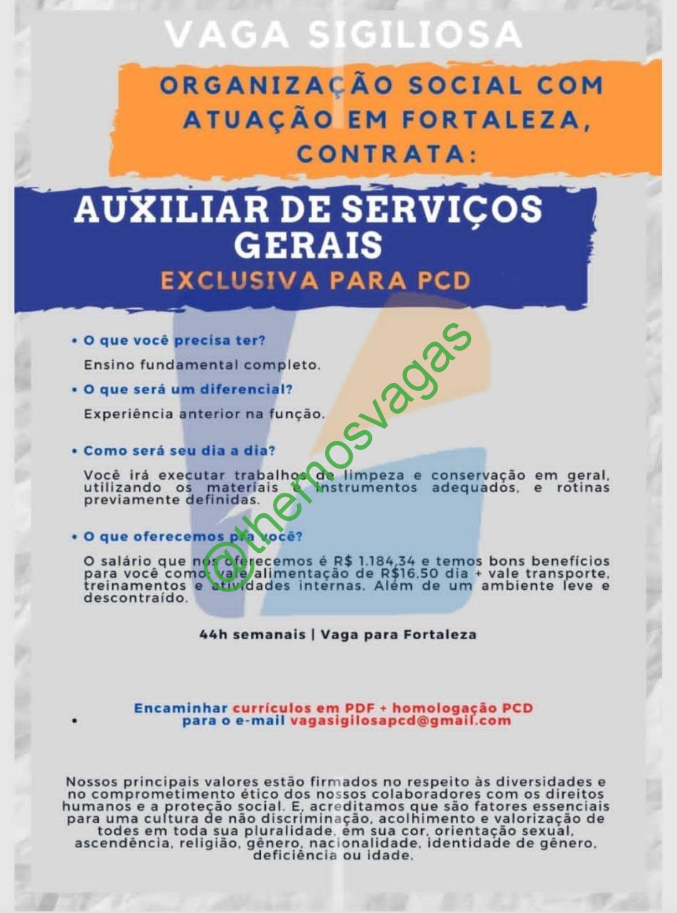 – Interessados(as) e que atendam ao perfil solicitado acima, devem enviar o currículo para o e-mail vagasigilosapcd@gmail.com, contendo no título/assunto “Auxiliar Serviços Gerais(PCD) – FOR“.