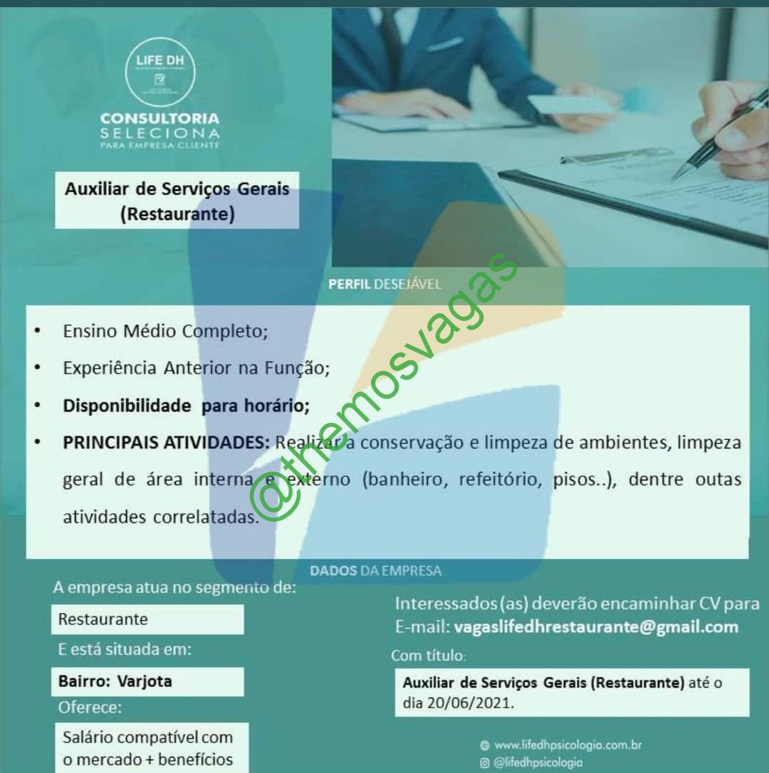 – Interessados(as) e que atendam ao perfil solicitado acima, devem enviar o currículo até 20|06|2021 para o e-mail vagaslifedgrestaurante@gmail.com, contendo no titulo/assunto “Auxiliar Serviços Gerais (Restaurante) – FOR