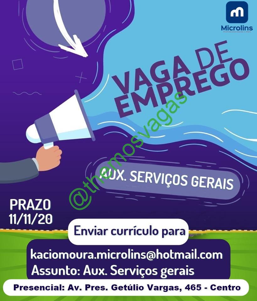– Interessados(as) e que atendam ao perfil solicitado acima, devem enviar o currículo até 11/11/2020 para o e-mail kaciomoura.microlins@hotmail.com contendo no título/assunto “Aux Serviços Gerais