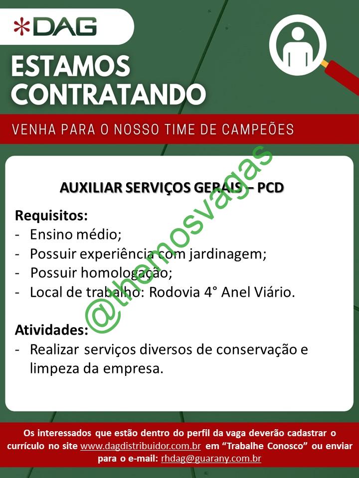 – Interessados(as) e que atendam ao perfil solicitado acima, devem enviar o currículo para o e-mail rhdag@guarany.com.br, contendo no título/assunto “Aux Serviços Gerais – FOR”, ou se cadastrar no site de cadastro