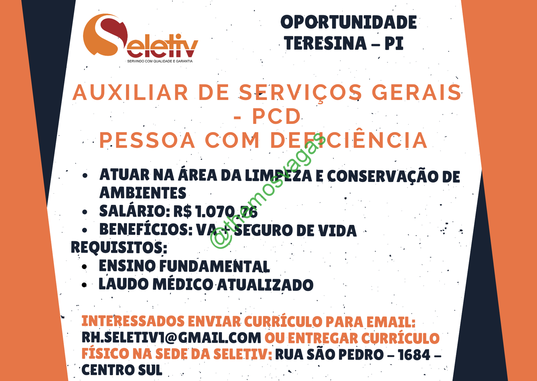 – Interessados(as) e que atendam ao perfil solicitado acima, devem enviar o currículo para o e-mail rh.seletiv1@gmail.com contendo no título/assunto “ASG PCD THE” ou entregar na Rua São Pedro, 1684- Centro/Sul – Teresina/PI