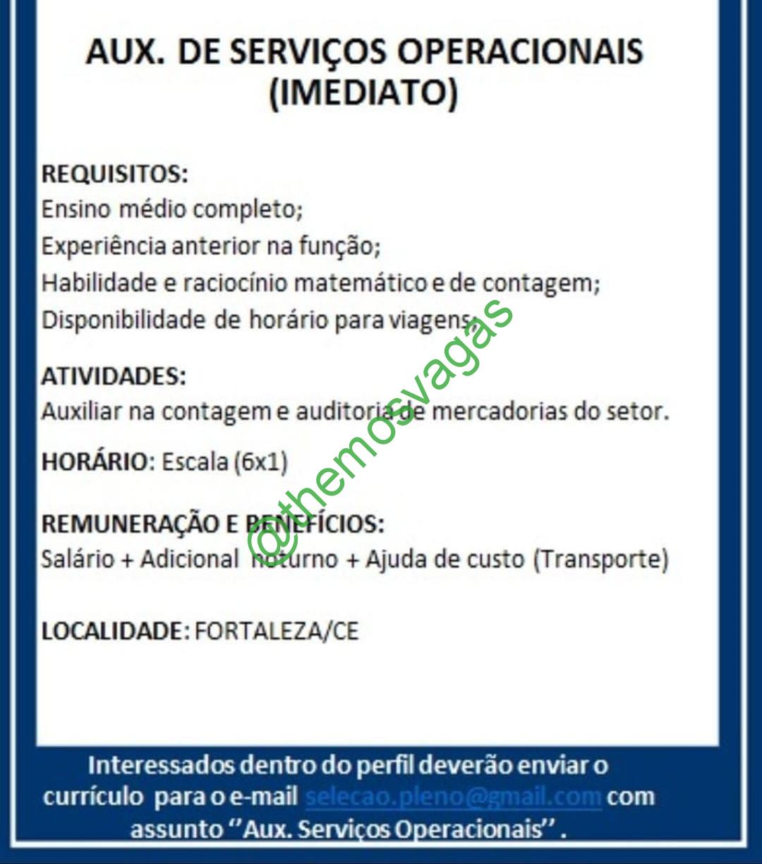 Auxiliar Serviços Operacionais | Fortaleza – CE | 01 vaga(s)