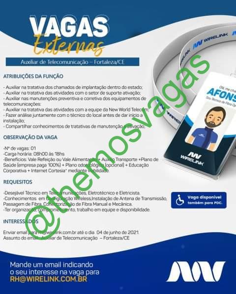 – Interessados(as) e que atendam ao perfil solicitado acima, devem enviar o currículo até 27|07|2021 para o e-mail rh@wirelink.com.br, contendo no titulo/assunto “Aux Téc em Telecomunicação – FOR”.