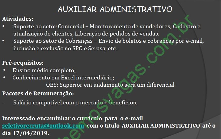 – Interessados(as) e que atendam aos requisitos devem enviar o perfil profissional até o dia 17/04/2019, colocando no título do e-mail “Auxiliar Administrativo”, para: seletivorecruta@outlook.com