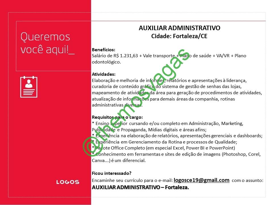 – Interessados(as) e que atendam ao perfil solicitado acima, devem enviar o currículo para o e-mail logosce19@gmail.com contendo no título/assunto “Auxiliar Administrativo – FOR“.