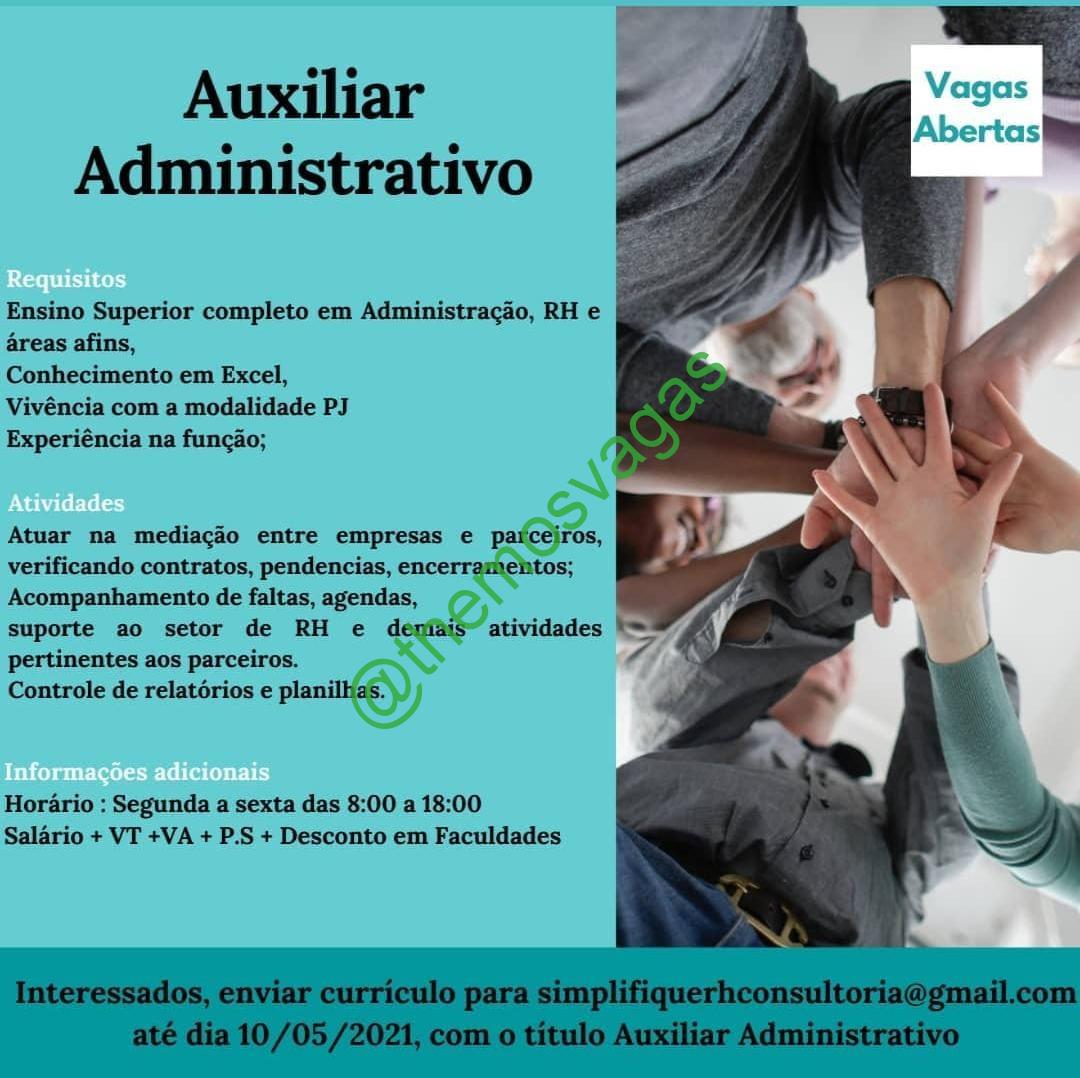 – Interessados(as) e que atendam ao perfil solicitado acima, devem enviar o currículo até 10|05|2021 para o e-mail simplifiquerhconsultoria@gmail.com, contendo no título/assunto “Auxiliar Administrativo – FOR“.