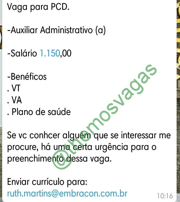 – Interessados(as) e que atendam ao perfil solicitado acima, devem enviar o currículo para o e-mail ruth.martins@embracon.com.br , colocando no título “Auxiliar Administrativo PCD”.