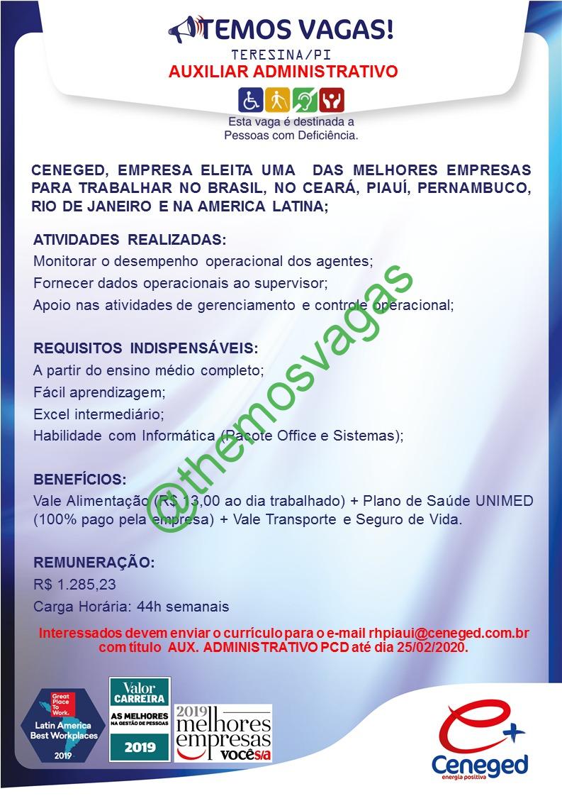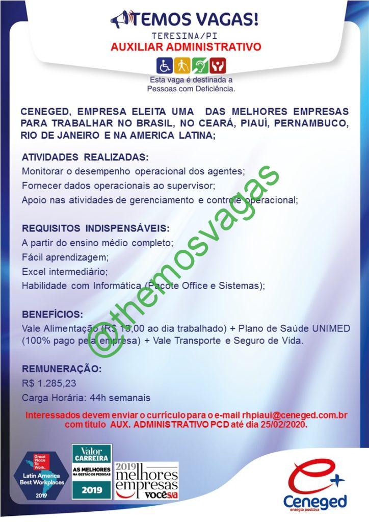– Interessados(as) e que atendam ao perfil solicitado acima, devem enviar o currículo até 25/02/2020 para o e-mail rhpiaui@ceneged.com.br contendo no título/assunto “Aux. Administrativo PCD