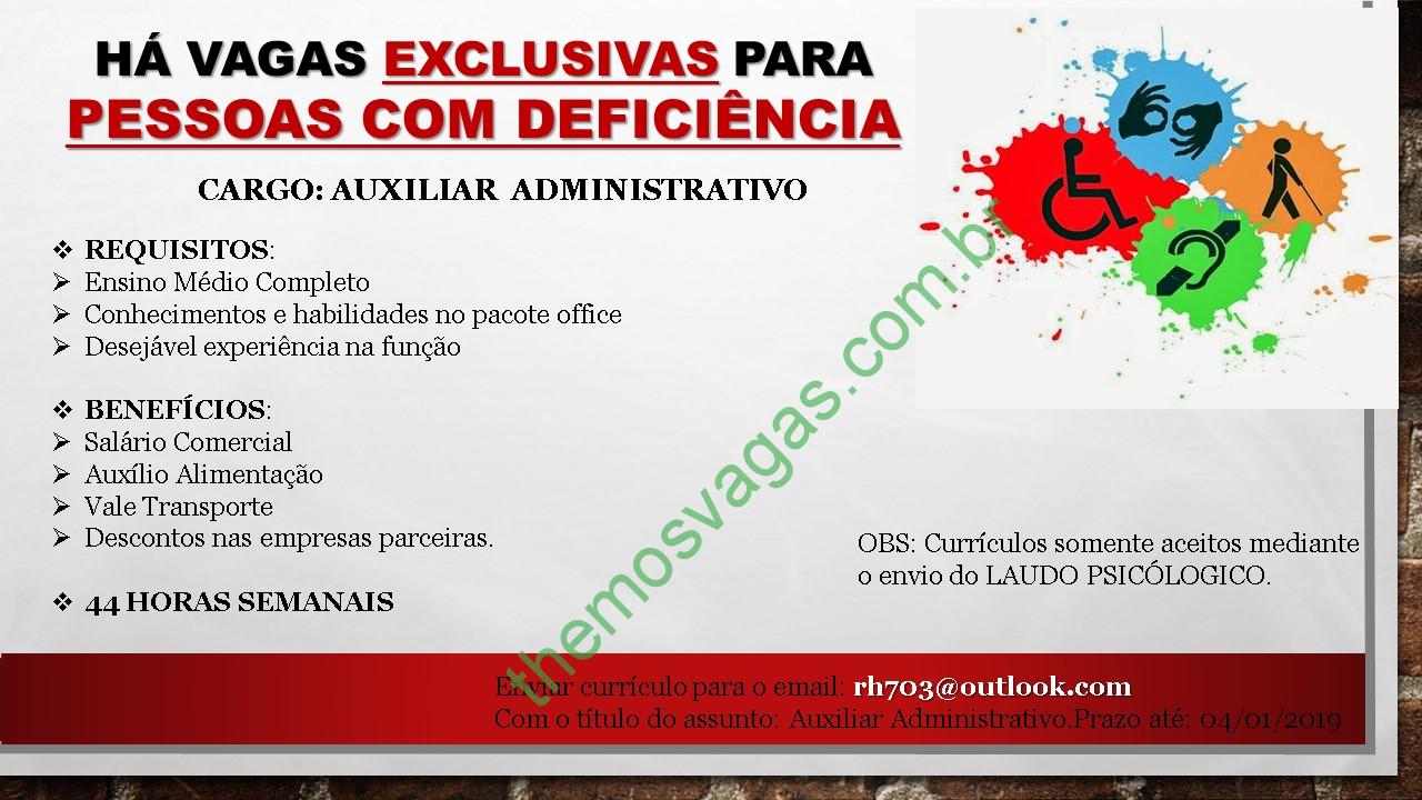 Interessados(as) e que atendam aos requisitos exigidos na imagem acima devem enviar o perfil profissional até 04/01/2019, colocando no título/assunto do e-mail “Auxiliar Administrativo PCD”, para rh703@outlook.com .