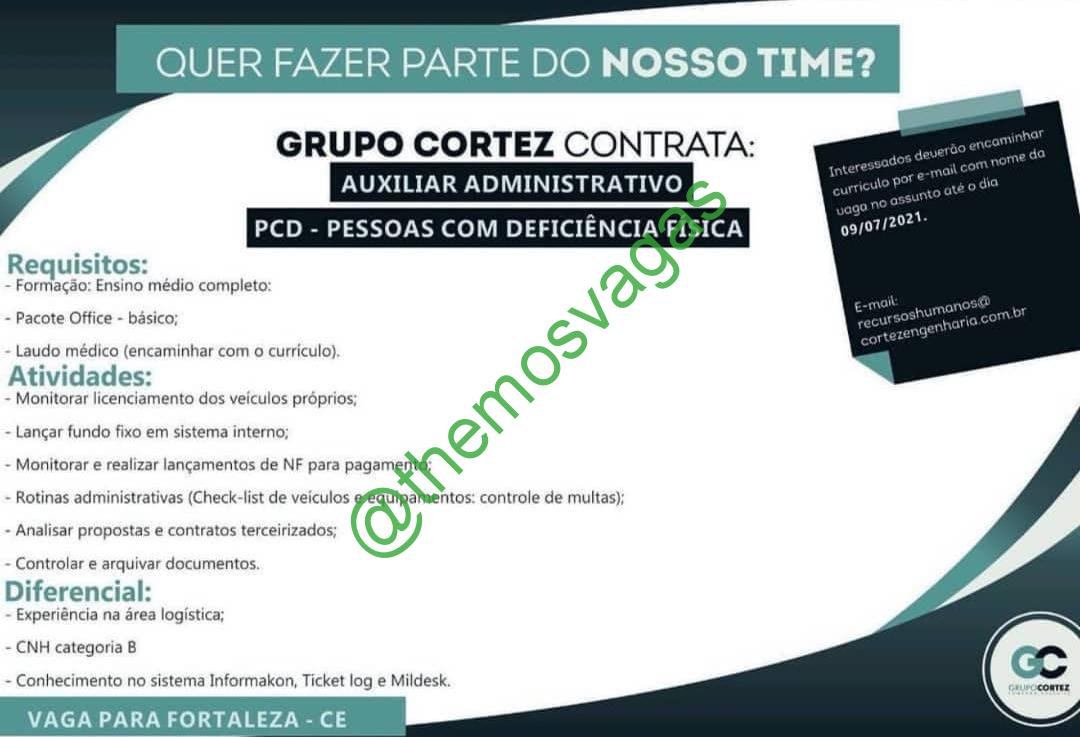 – Interessados(as) e que atendam ao perfil solicitado acima, devem enviar o currículo até 09/07/2021 para o e-mail recursoshumanos@cortezengenharia.com.br, contendo no titulo/assunto “Auxiliar Administrativo PCD – FOR”.