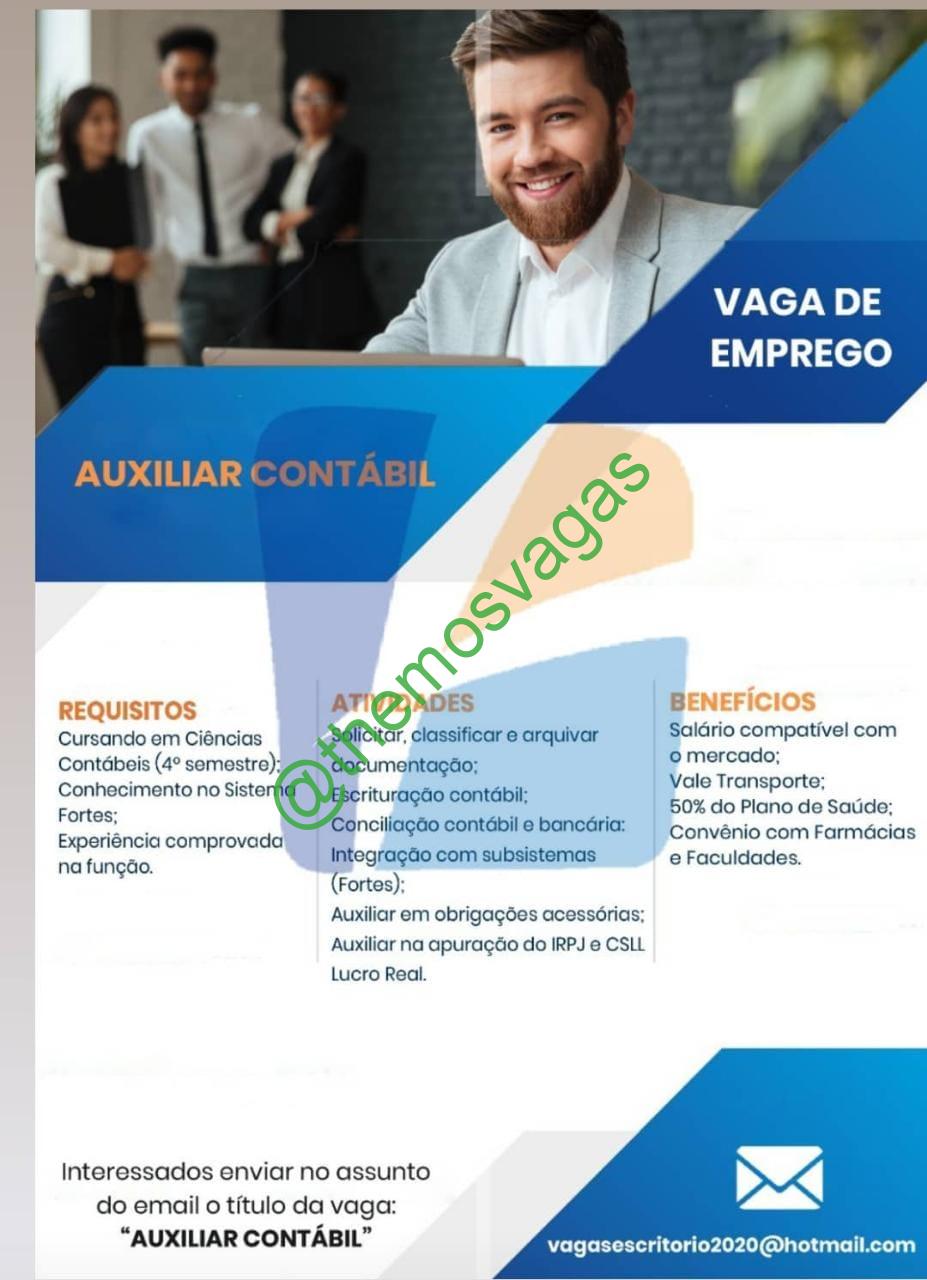 – Interessados(as) e que atendam ao perfil solicitado acima, devem enviar o currículo para o e-mail vagasescritorio2020@hotmail.com, contendo no titulo/assunto “Auxiliar Contábil – FOR”.