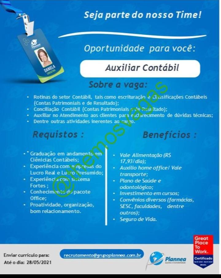– Interessados(as) e que atendam ao perfil solicitado acima, devem enviar o currículo até 01/06/2021 para o e-mail recrutamento@grupoplannea.com.br, contendo no título/assunto “Anaista Contábil – FOR“.