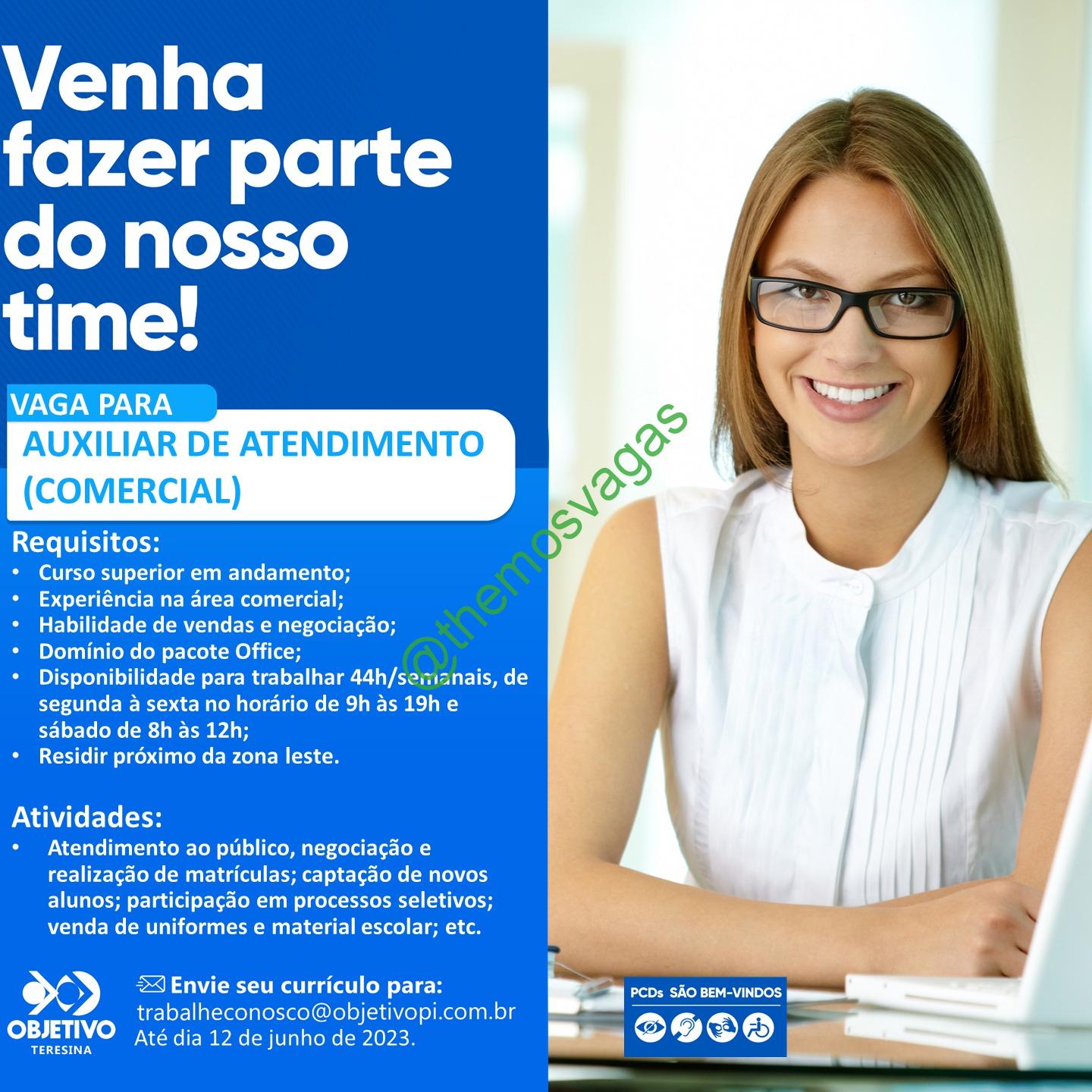 – Interessados(as) e que atendam ao perfil solicitado acima devem enviar o currículo até 12/06/2023 para o e-mail trabalheconosco@objetivopi.com.br contendo no título/assunto “Auxiliar de Atendimento – THE“.