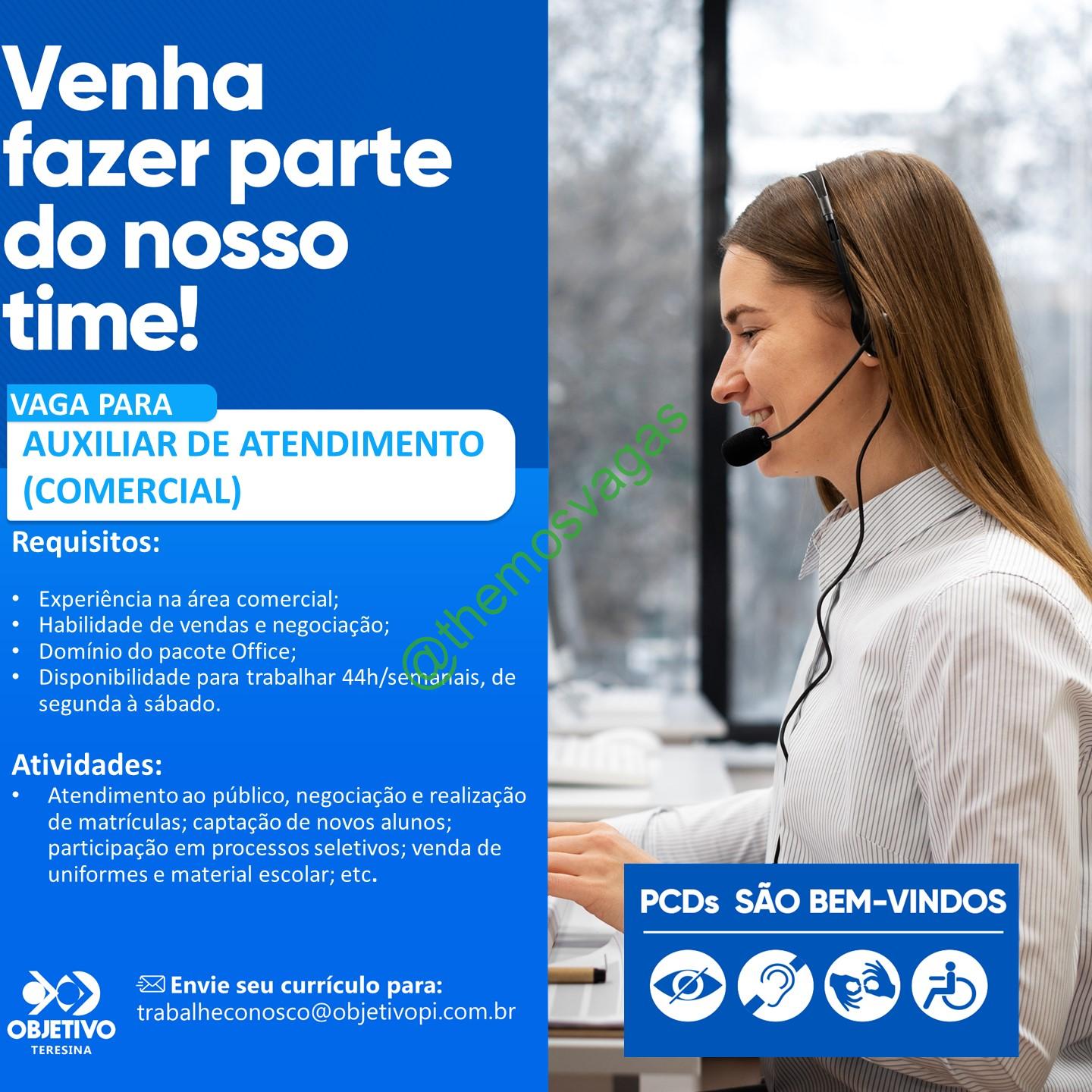 – Interessados(as) e que atendam ao perfil solicitado acima devem enviar o currículo para o e-mail trabalheconosco@objetivopi.com.br contendo no título/assunto “Auxiliar de Atendimento – THE“.