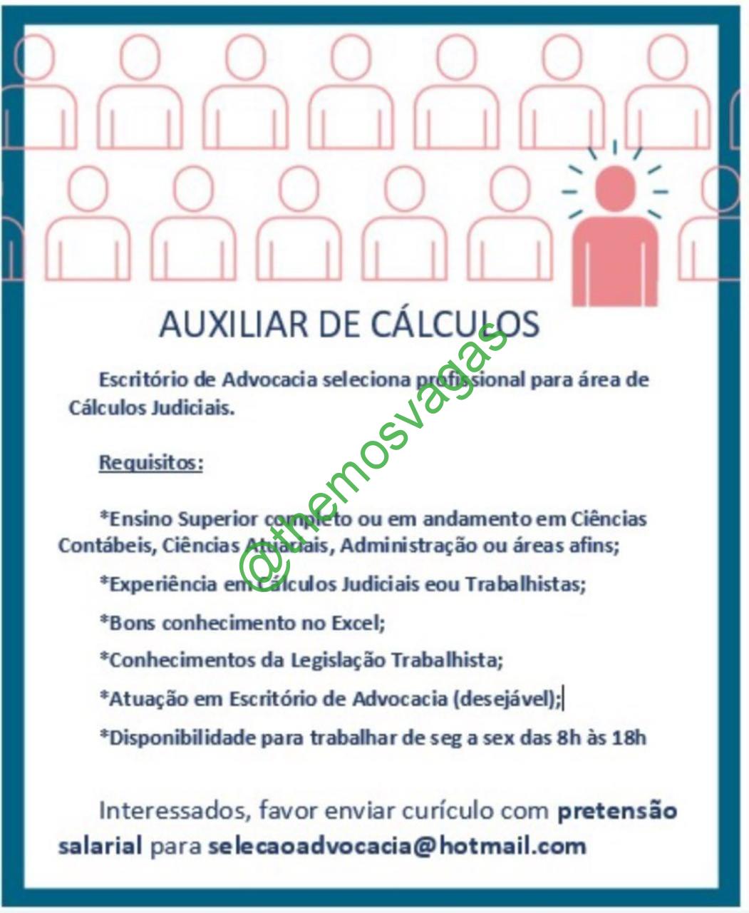 – Interessados(as) e que atendam ao perfil solicitado acima, devem enviar o currículo para o e-mail selecaoadvocacia@hotmail.com, contendo no título/assunto “Auxiliar de Cálculo – FOR“.